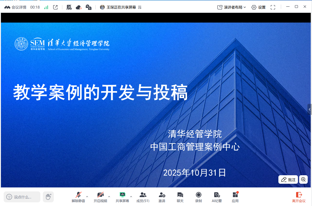 10月31日,为提升研究生师资的教学与案例开发水平,经济与管理学院组织研究生教师参加一场以“中国工商管理案例库案例入库及评审标准解读”为主题的专题培训线上讲座。此次讲座由山东财经大学主办,特别邀请清华大学经管学院案例研究员王琛女士,目的在于增强教师对案例教学及案例开发的认知,提升案例写作的质量与效率。